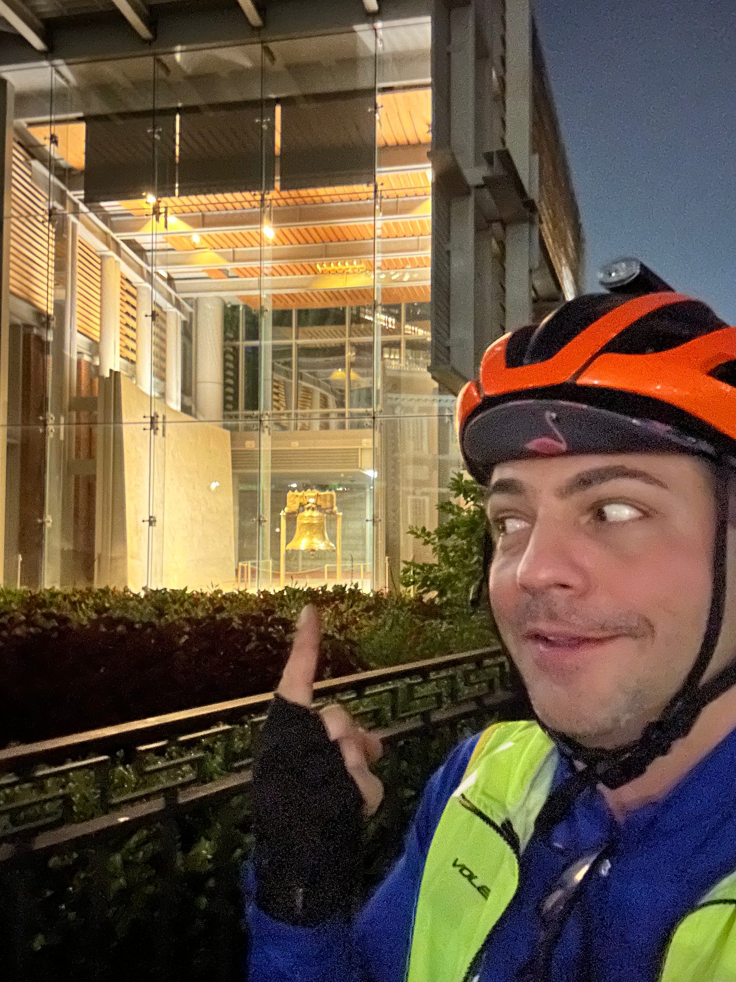 The rest was a blur of twisting, cobbled-together paths forming the Schuylkill River Trail—from Plymouth Meeting through Manayunk into downtown Philly. I rode past the Art Museum blasting the Rocky theme at 4 a.m., down toward City Hall—no one else in sight. Twelve blocks down Market Street, I reached my destination. Celebratory selfies were had outside the Liberty Bell while a homeless man fought invisible enemies a hundred feet away.