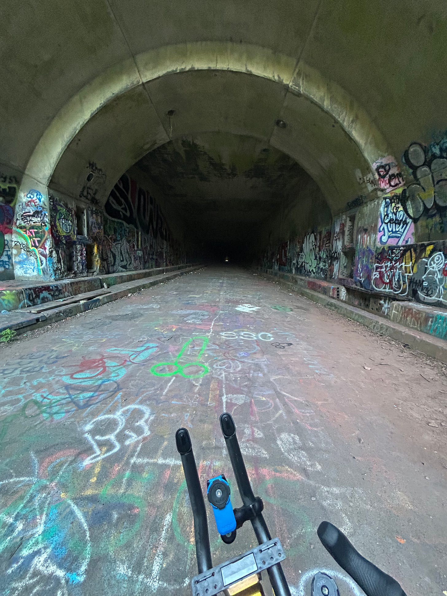 I left before sunrise, starting the long haul through the nothingness of Central PA—first crossing eight miles of an abandoned PA Turnpike section. Two tunnels, each half a mile long, walls covered in graffiti, glowing under my dynamo light.