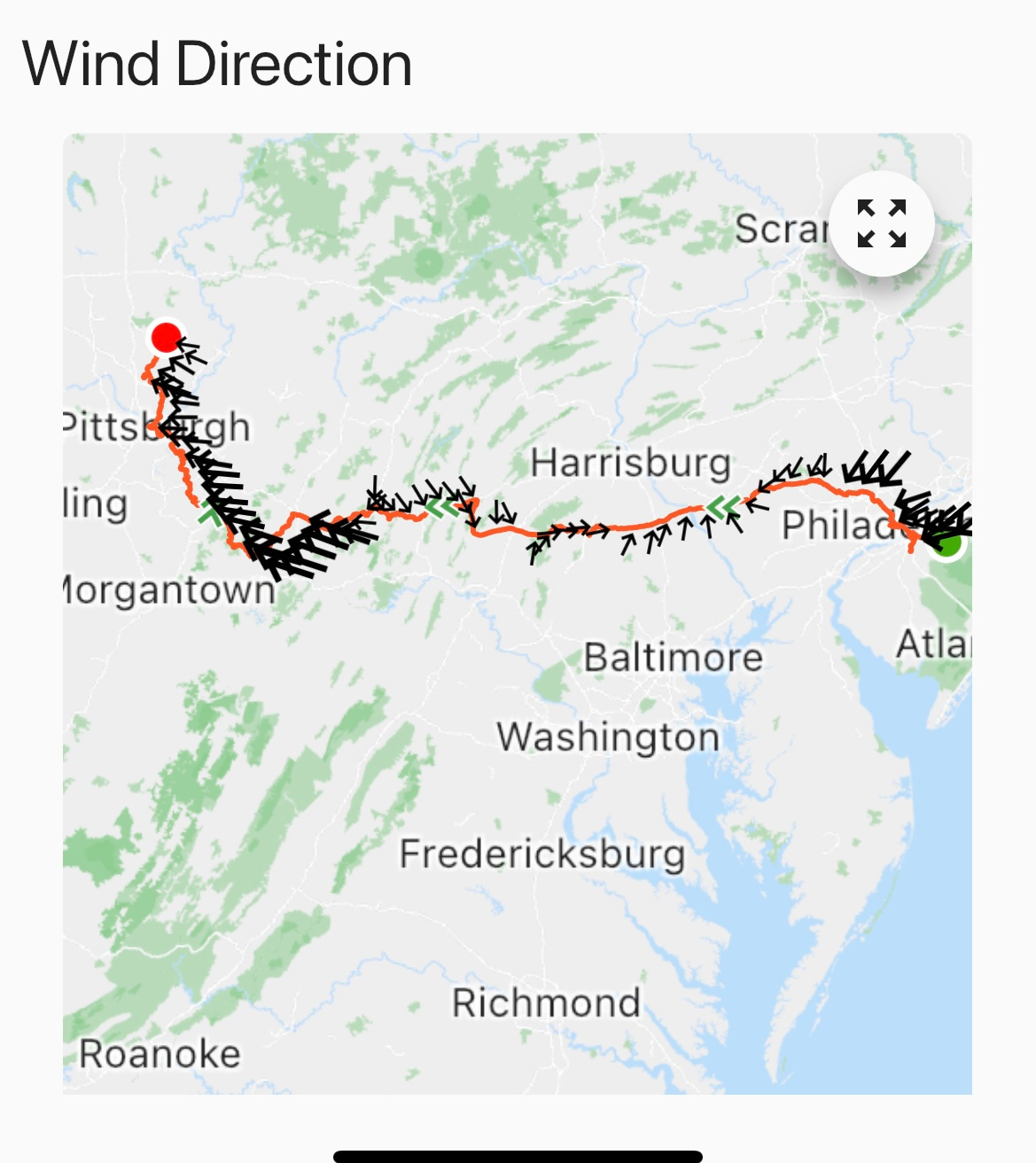 When it’s ridden as a race versus a solo endeavor, they alternate directions each year. This year was Pittsburgh to Philly; last year was the opposite. I’d thought about racing it at one point (though racing in cycling doesn’t appeal to me at all), and if I did, I’d want to go from west to east. Why, you ask? Because that’s the way the wind usually blows—and by the least scientific math imaginable, a tailwind can make a ride feel up to 50% easier than a headwind. So, I was happy to see that was the case as Chrissy and I drove west from NJ.